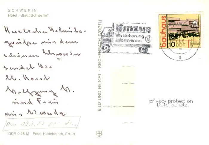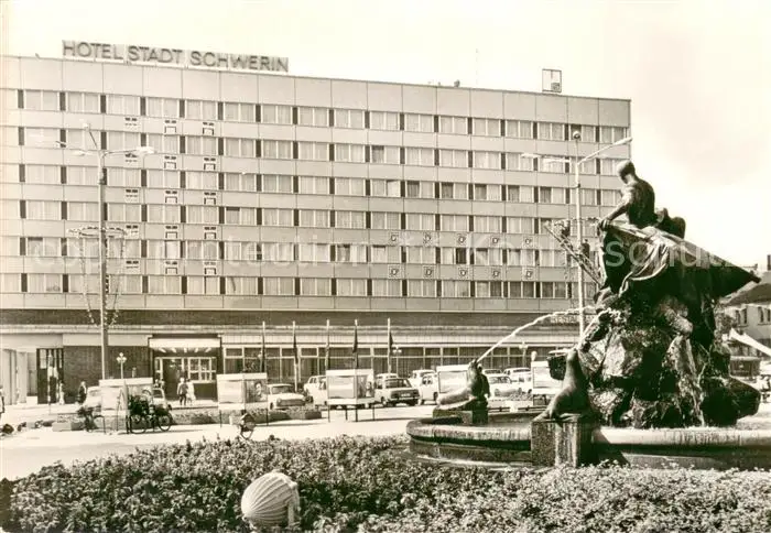 Schwerin_Mecklenburg Hotel Stadt Schwerin Brunnen Schwerin_Mecklenburg postalisch gelaufen 1980 Erhaltung siehe scans [FriedD77] Frierer