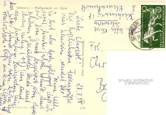 Schwerin_Mecklenburg Pfaffenteich mit Dom Schwaene Schwerin_Mecklenburg postalisch gelaufen 1958 Erhaltung siehe scans [FriedD77] Frierer