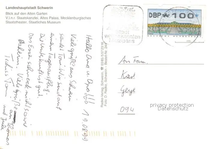 Schwerin__Mecklenburg Blick auf den Alten Garten Staatskanzlei Altes Palais Staatstheater Museum Landeshauptstadt postalisch gelaufen 1999 Erhaltung siehe scans [FriedD77] Frierer