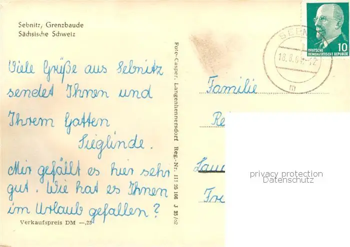 Sebnitz Grenzbaude Sebnitz postalisch gelaufen 1964 Erhaltung siehe scans [WerneD78] WernPID7