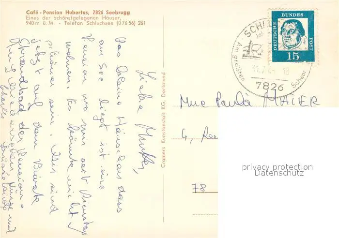 Seebrugg Cafe Pension Hubertus am Schluchsee Seebrugg postalisch gelaufen 1965 Erhaltung siehe scans [WerneD78] WernPID7