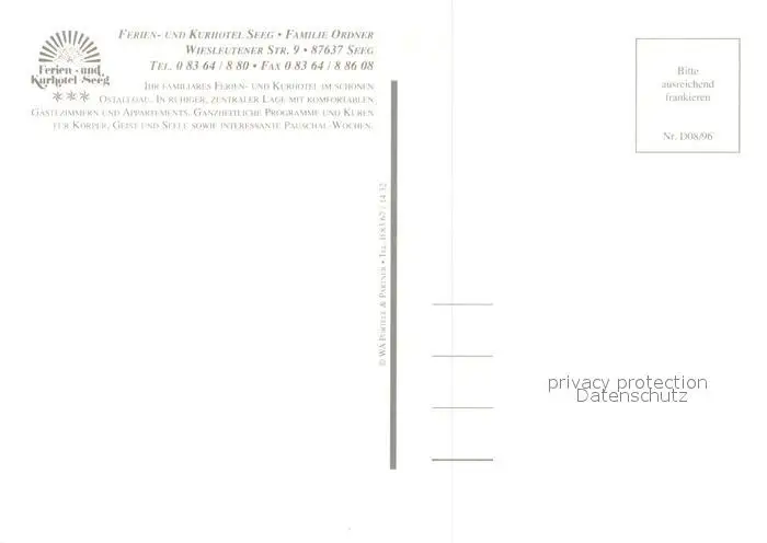 Seeg Ferien- und Kurhotel Seeg postalisch nicht gelaufen 1996 Erhaltung siehe scans [FriedD77] Frierer