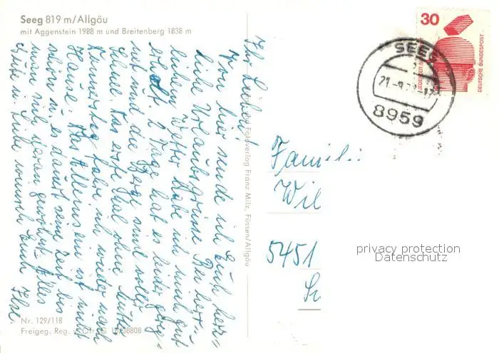 Seeg Fliegeraufnahme mit Aggenstein und Breitenberg Seeg postalisch gelaufen 1973 Erhaltung siehe scans [WerneD78] WernPID7