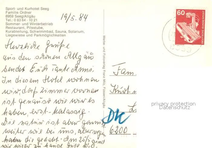 Seeg Kur- und Sporthotel Restaurant Fremdenzimmer Hallenbad Landschaftspanorama Alpen Seeg postalisch gelaufen 1984 Erhaltung siehe scans [FriedD77] Frierer