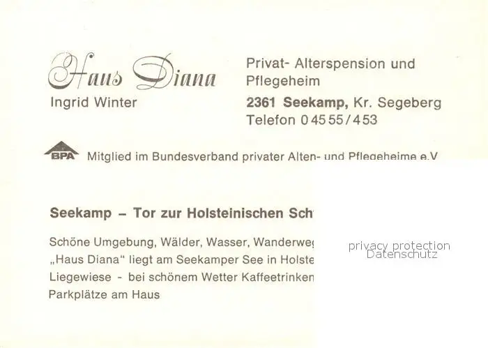 Seekamp_Bad_Segeberg Pension Pflegeheim Haus Diana Seekamp_Bad_Segeberg postalisch nicht gelaufen nach 1965 Werbekarte (keine Postkarte) Erhaltung siehe scans [FriedD77] Werbekarte (keine Postkarte) Frierer