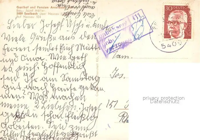 Seelbach_Nassau Gasthof Pension Arnsteiner Hof Kloster Arnstein Seelbach Nassau postalisch gelaufen 1972 Erhaltung siehe scans [FriedD77] Frierer