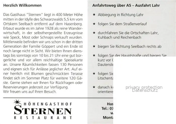 Seelbach_Schutter Hoehengasthof Sternen Restaurant Seelbach Schutter postalisch nicht gelaufen nach 1965 Werbekarte (keine Postkarte) Erhaltung siehe scans [FriedD77] Werbekarte (keine Postkarte) Frierer