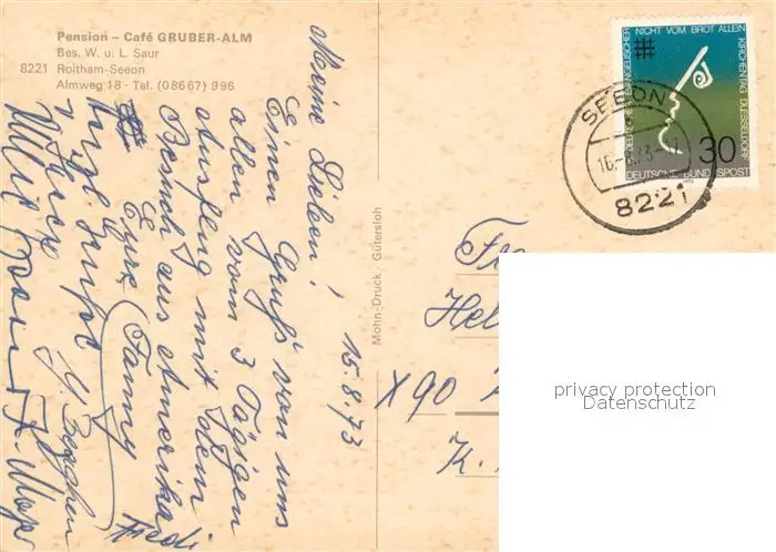 Seeon-Seebruck Pension Gruber Alm Cafe Seeon-Seebruck postalisch gelaufen 1973 Erhaltung siehe scans [FriedD77] Frierer