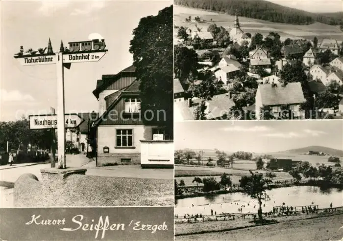 AK / Ansichtskarte Seiffen_Erzgebirge Ortsansicht mit Kirche Badesee Wegweiser Seiffen Erzgebirge