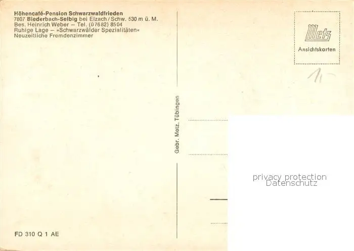 Selbig_Biederbach Hoehencafé Pension Schwarzwaldfrieden Landschaftspanorama Schwarzwald postalisch nicht gelaufen nach 1965 Erhaltung siehe scans [FriedD77] Frierer