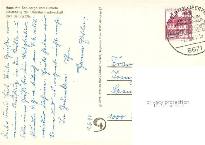 Selbitz_Oberfranken Gaestehaus der Christusbruderschaft Fliegeraufnahme Selbitz Oberfranken postalisch gelaufen 1984 Erhaltung siehe scans [WerneD78] WernPID7