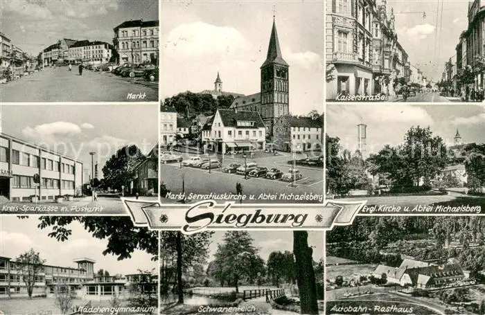 AK / Ansichtskarte Siegburg Markt Sparkasse Postamt Gymnasium Abtei Michaelsberg Schwanenteich Kaiserstrasse Kirche Autobahnrasthaus Siegburg