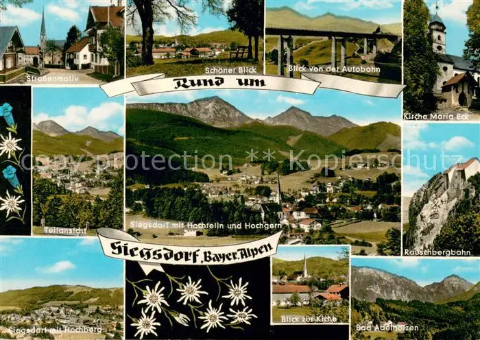 Siegsdorf_Oberbayern Strassenpartie Autobahnblick Kirche Maria Eck Fliegeraufnahme Rauschbergbahn Hochberg Kirche Bad Adelholzen Siegsdorf Oberbayern postalisch nicht gelaufen nach 1965 Erhaltung siehe scans [WerneD78] WernPID7