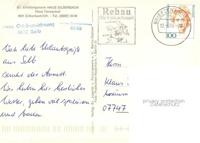 Silberbach_Eger Erholungsheim Haus Silberbach Haus Tannenhof Silberbach Eger postalisch gelaufen 2000 Erhaltung siehe scans [FriedD77] Frierer