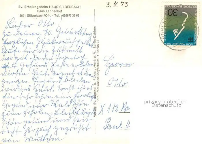 Silberbach_Eger Erholungsheim Haus Silberbach im Fichtelgebirge Haus Tannenhof Silberbach Eger postalisch gelaufen 1973 Erhaltung siehe scans [FriedD77] Frierer