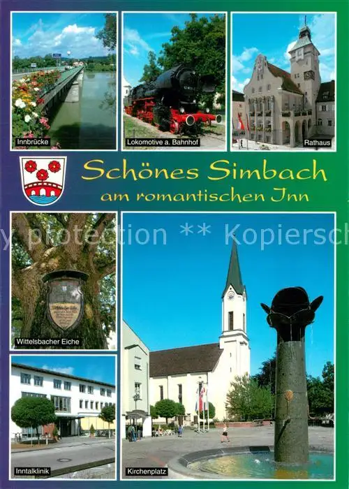 AK / Ansichtskarte Simbach_Inn Innbruecke Lokomotive Rathaus Wittelsbacher Eiche Inntalklinik Kirchenplatz Brunnen Simbach Inn