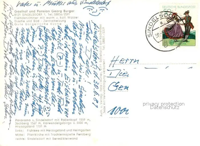 Sindelsdorf Panorama Gasthof und Metzgerei zur Post Gaststube Kirche Sindelsdorf postalisch gelaufen 1981 Erhaltung siehe scans [WerneD78] WernPID7