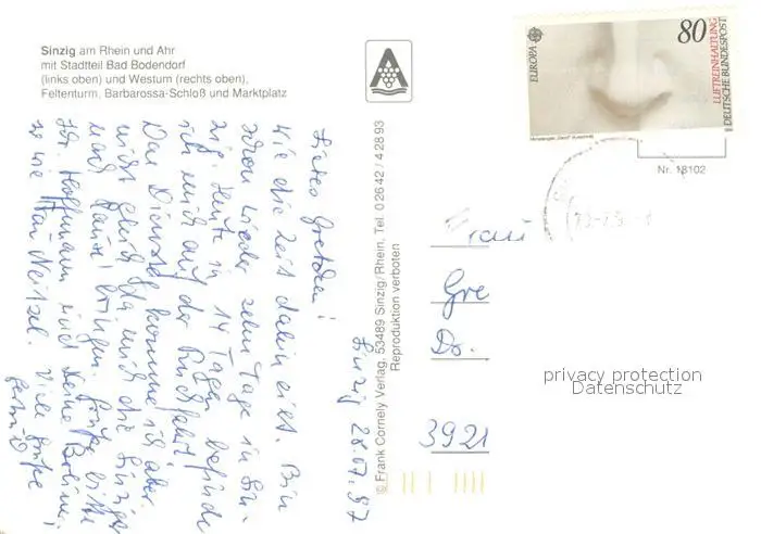 Sinzig Panorama Westturm Teilansichten Freibad Barbarossa Schloss Rheinpartie Sinzig postalisch gelaufen 1997 Erhaltung siehe scans [WerneD78] WernPID7