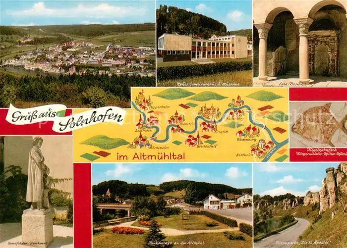 Solnhofen Panorama Altmuehltal Gemeindehaus Museum Basilika Kugelzahnfisch Museum Felsen Die 12 Apostel Park Denkmal Solnhofen postalisch nicht gelaufen nach 1965 Erhaltung siehe scans [FriedD77] Frierer