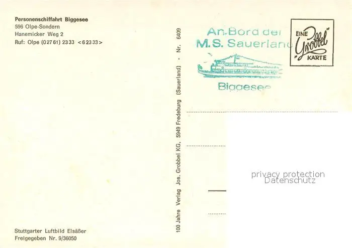 Sondern_Biggesee Personenschiffahrt Biggesee Fliegeraufnahme Sondern Biggesee postalisch nicht gelaufen nach 1965 Erhaltung siehe scans [WerneD78] WernPID7