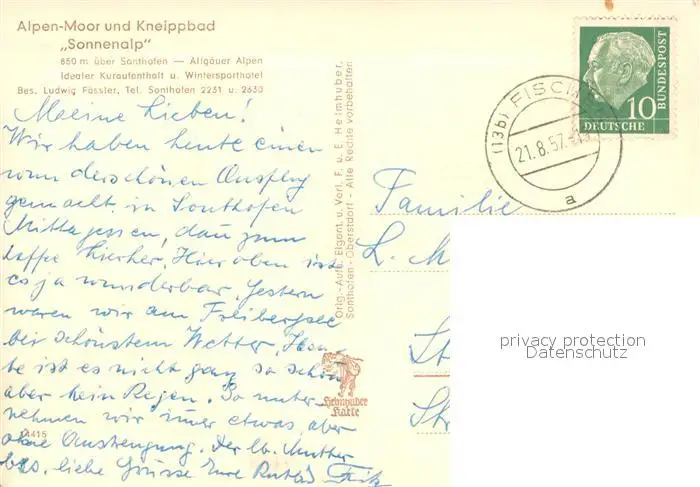Sonthofen_Oberallgaeu Alpen Moor und Kneippbad Sonnenalp Panorama Sonthofen Oberallgaeu postalisch gelaufen 1957 Erhaltung siehe scans [WerneD78] WernPID7