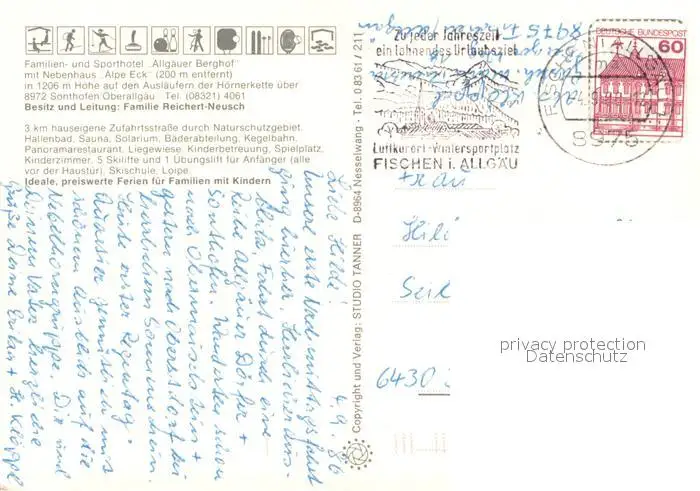 Sonthofen_Oberallgaeu Familien und Sporthotel Allgaeuer Berghof Sonthofen Oberallgaeu postalisch gelaufen 1986 Erhaltung siehe scans [WerneD78] WernPID7