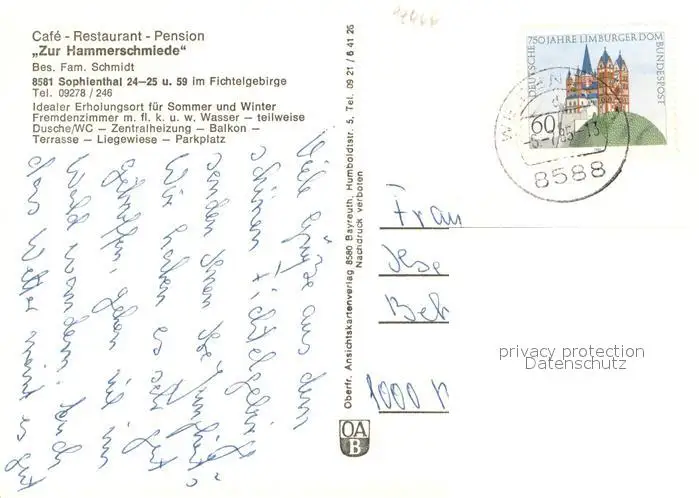 Sophienthal_Oberfranken Cafe Restaurant Pension Zur Hammerschmiede Gaststube Gartenterrasse Sophienthal Oberfranken postalisch gelaufen 1985 Erhaltung siehe scans [WerneD78] WernPID7