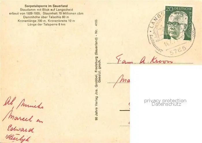 Sorpeseetalsperre Staudamm mit Blick auf Langscheid postalisch gelaufen nach 1965 Erhaltung siehe scans [WerneD78] WernPID7
