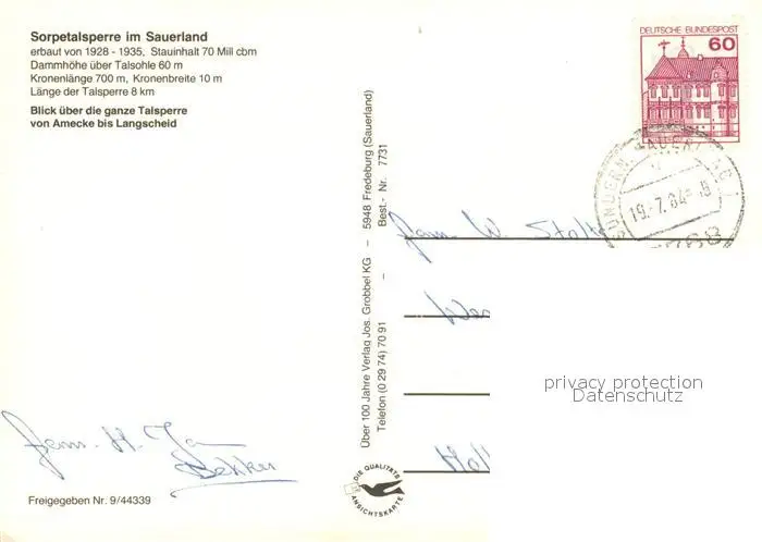 Sorpetalsperre Fliegeraufnahme Sorpetalsperre postalisch gelaufen 1984 Erhaltung siehe scans [WerneD78] WernPID7