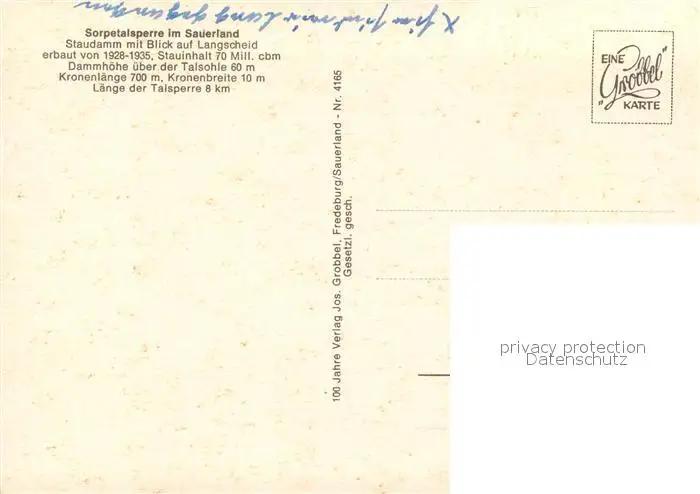 Sorpetalsperre Staudamm mit Blick auf Langenscheid Sorpetalsperre postalisch nicht gelaufen nach 1965 Erhaltung siehe scans [WerneD78] WernPID7