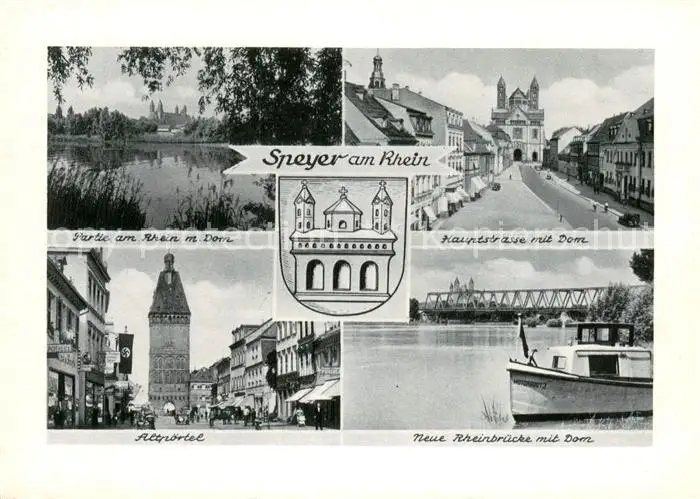 Speyer_Rhein Partie am Rhein mit Dom Hauptstrasse Altpoertel Rheinbruecke Kupfertiefdruck Speyer Rhein postalisch nicht gelaufen 1921-1965 Erhaltung siehe scans [FriedD77] Frierer