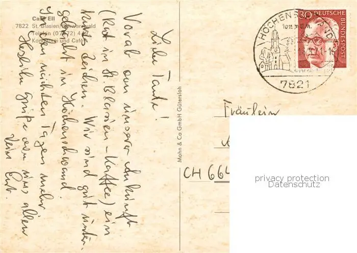 St_Blasien Konditorei Kaffee Ell St_Blasien postalisch gelaufen 1973 Erhaltung siehe scans [FriedD77] Frierer