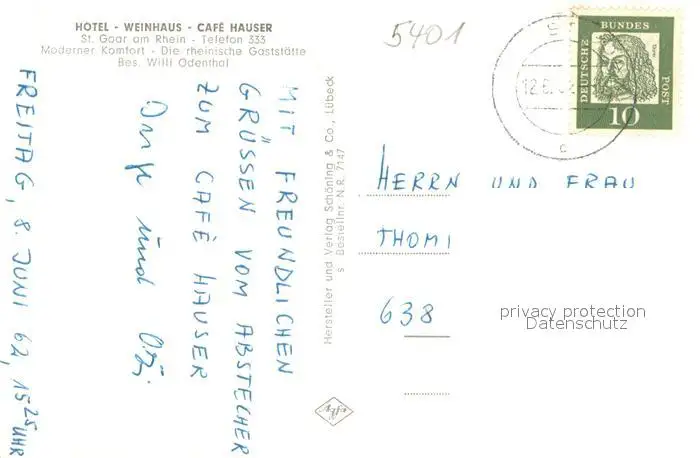 St_Goar Hotel Weinhaus Cafe Hauser St_Goar postalisch gelaufen 1962 Erhaltung siehe scans [WerneD78] WernPID7