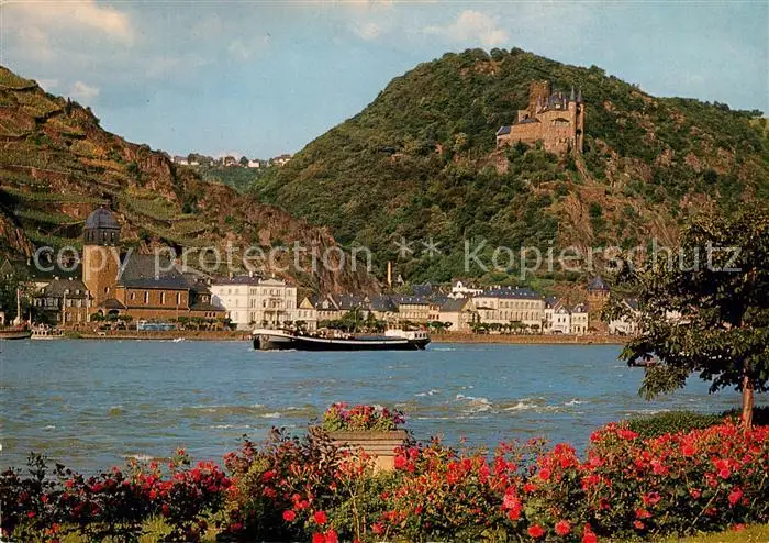 AK / Ansichtskarte St_Goarshausen Blick ueber den Rhein zur Burg Katz Binnenschifffahrt St_Goarshausen
