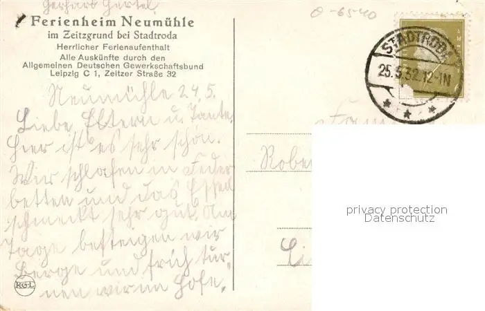 Stadtroda Ferienheim Neumuehle im Zeitzgrund Landschaftspanorama Thueringer Wald Stadtroda postalisch gelaufen 1932 Erhaltung siehe scans [FriedD77] Frierer