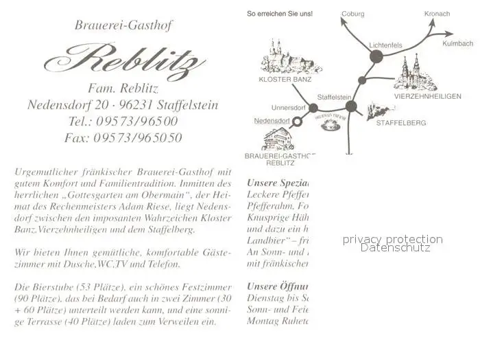 Staffelstein Brauerei Gasthof Reblitz Staffelstein postalisch nicht gelaufen nach 1965 Werbekarte (keine Postkarte) Erhaltung siehe scans [FriedD77] Werbekarte (keine Postkarte) Frierer