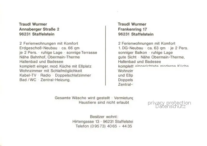 Staffelstein Ferienwohnungen Traudl Wurmer Staffelstein postalisch nicht gelaufen nach 1965 Werbekarte (keine Postkarte) Erhaltung siehe scans [FriedD77] Werbekarte (keine Postkarte) Frierer