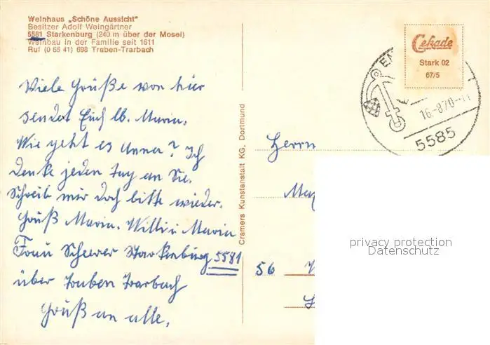 Starkenburg Weinhaus Schoene Aussicht Landschaftspanorama Moseltal Starkenburg postalisch gelaufen 1970 Erhaltung siehe scans [FriedD77] Frierer