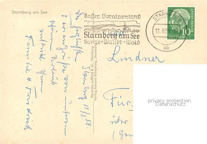 Starnberg Kategorie Alte Ansichtskarten Postkarten bx87700 Starnberg Fliegeraufnahme Partie am See Starnberg postalisch gelaufen 1958 Erhaltung siehe scans [LiesaD40]