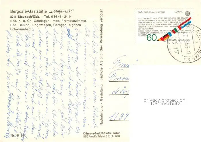 Staudach_Oberbayern Bergcafe Gaststaette Muehlwinkl Freibad Panorama Hochgern Gastraum Staudach Oberbayern postalisch gelaufen 1985 Erhaltung siehe scans [WerneD78] WernPID7