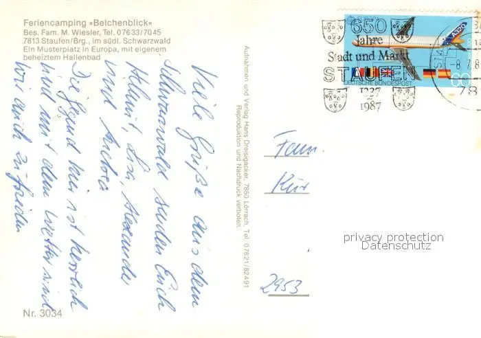 Staufen_Breisgau Feriencamping Belchenblick im Schwarzwald Staufen Breisgau postalisch gelaufen 1988 Fliegeraufnahme Erhaltung siehe scans [FriedD77] Fliegeraufnahme Frierer