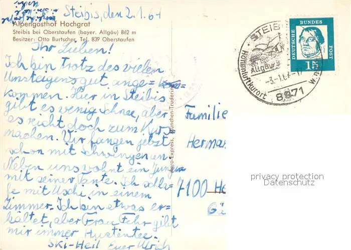 Steibis Alpengasthof Hochgrat Allgaeuer Alpen Steibis postalisch gelaufen 1964 Erhaltung siehe scans [FriedD77] Frierer