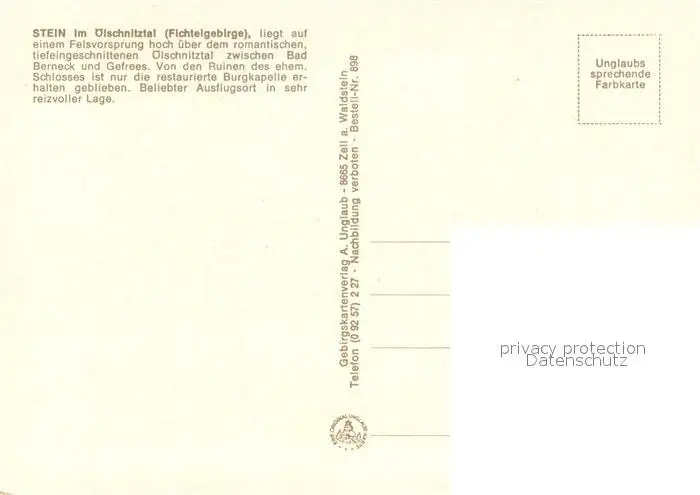 Stein_Fichtelgebirge oelschnitzquelle oelschnitztal Forellensteg oelschnitzforelle Talhang mit Weideroeschen Burgkapelle Stein Fichtelgebirge postalisch nicht gelaufen nach 1965 Erhaltung siehe scans [WerneD78] WernPID7