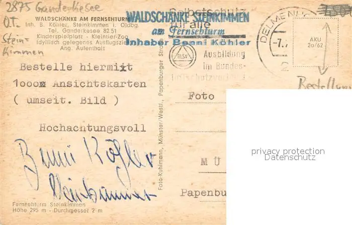 Steinkimmen Waldschaenke am Fernsehturm Bestellung mit Signatur des Wirts Steinkimmen postalisch gelaufen 1962 Erhaltung siehe scans [FriedD77] Frierer
