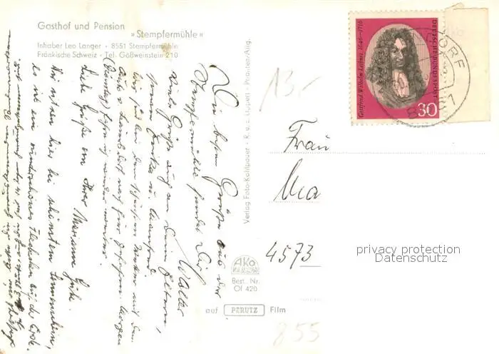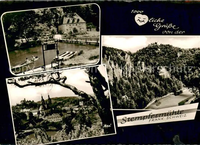 Stempfermuehle Gasthof Pension Stempfermuehle Landschaftspanorama Fraenkische Schweiz Ortsansicht mit Kirche Stempfermuehle postalisch gelaufen nach 1965 Erhaltung siehe scans [FriedD77] Frierer