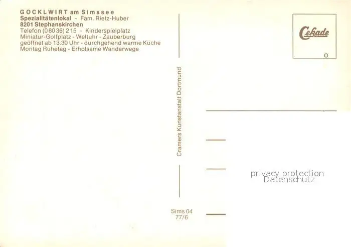 Stephanskirchen_Simssee Spezialitaetenlokal Gocklwirt Restaurant Stephanskirchen Simssee postalisch nicht gelaufen 1977 Erhaltung siehe scans [FriedD77] Frierer