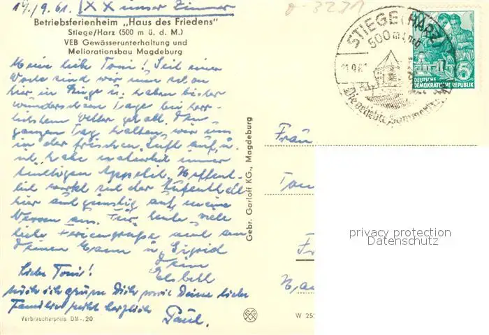Stiege Betriebsferienheim Haus des Friedens Stiege postalisch gelaufen 1961 Erhaltung siehe scans [LiesaD40] LiesID40