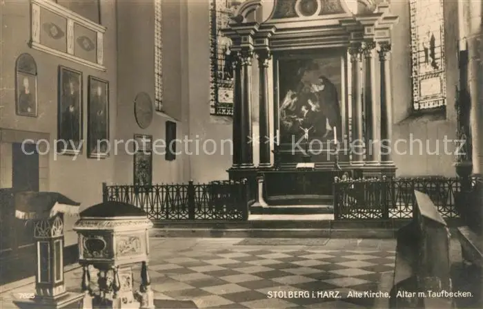 AK / Ansichtskarte Stolberg_Harz Alte Kirche Altar Taufbecken Stolberg Harz