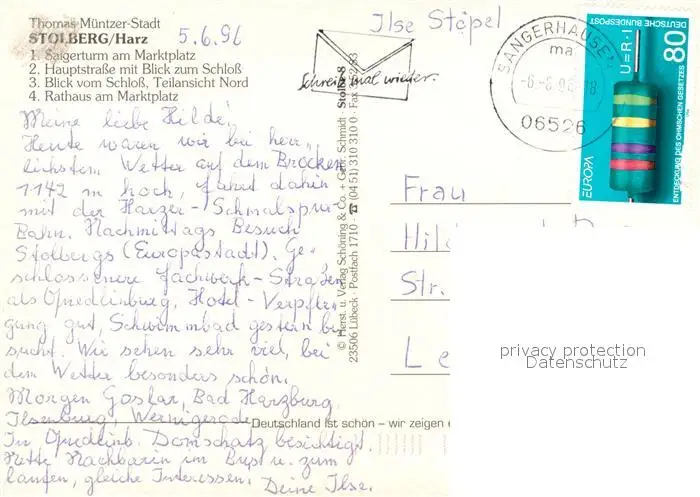 Stolberg_Harz Saigerturm Marktplatz Hauptstr Schloss Teilansicht Nord Rathaus Stolberg Harz postalisch gelaufen 1996 Erhaltung siehe scans [WerneD78] WernPID7