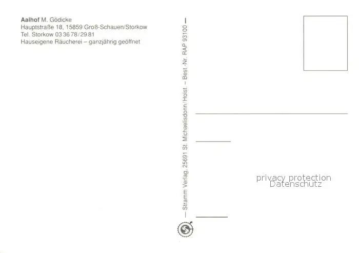 Storkow_Mark Aalhof Raeucherei Gaststaette Storkow Mark postalisch nicht gelaufen nach 1965 Erhaltung siehe scans [FriedD77] Frierer